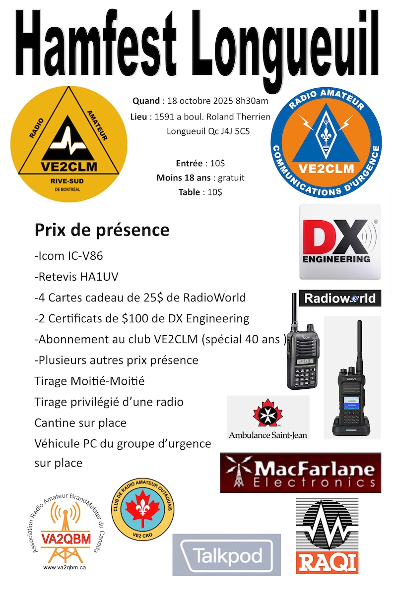 Le Hamfest 2025 du Club Radio Amateur de la Rive Sud de Montréal ouvrira ses portes le samedi le 18 octobre 2025, de 8 h 30 à 11 h 30